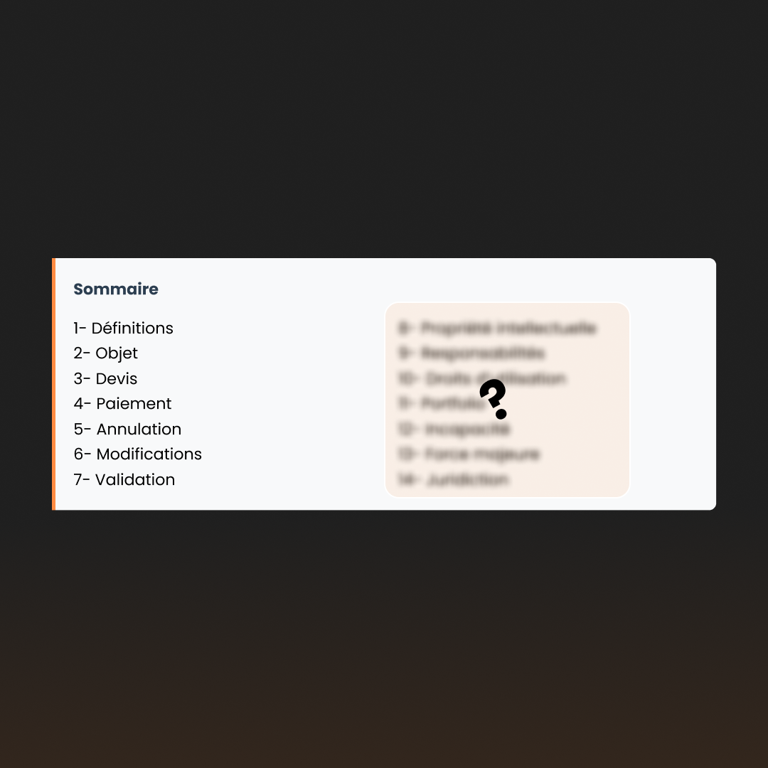 Les CGV sont ton bouclier juridique. Elles encadrent ta relation client, définissent clairement tes droits et obligations, et te protègent en cas de conflit.